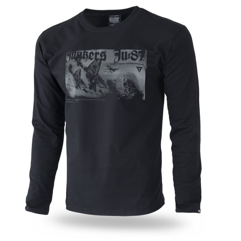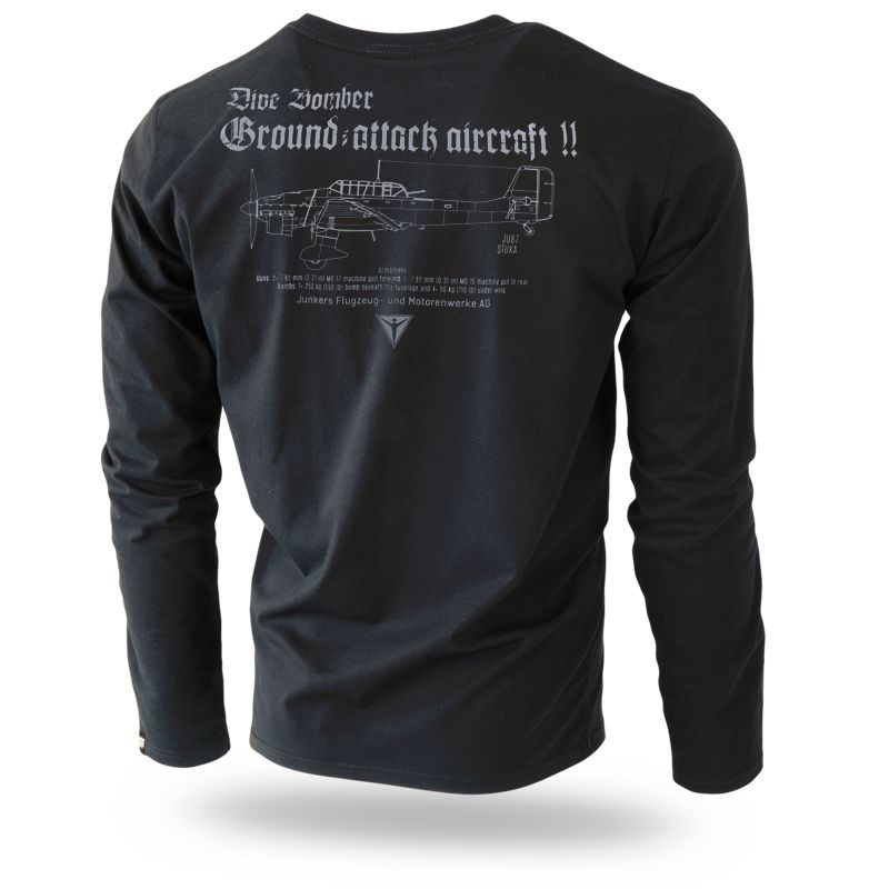Langarmshirt aus angenehmer Baumwolle. Mit schmalem elastischem Bund am Hals. Auf der Vorderseite sind Kampfflugzeuge Ju87 aus dem 2. Weltkrieg abgebildet. Auf der Rückseite befindet sich eine Zeichnung des Flugzeugs mit Bewaffnungsübersicht.