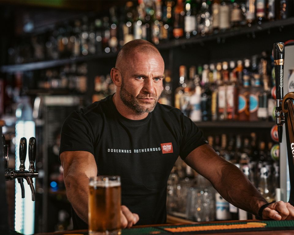 Das T-Shirt besteht aus Baumwolle mit einem Gewicht von 200 g. Auf der Vorderseite befindet sich ein großes Dobermans Brotherhood-Bedrucken, ergänzt durch ein kleines Markenlogo.