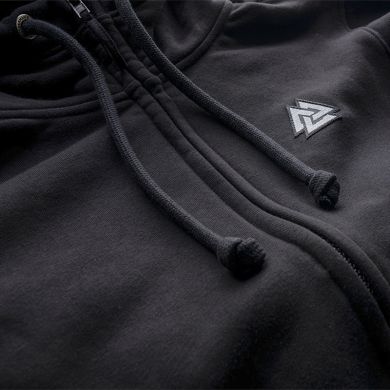 Hoodie aus hochwertiger Baumwolle mit Reißverschluss, versehen mit elastischen Bündchen und zwei Fronttaschen. Auf der Vorderseite befindet sich ein kleiner gestickter Aufnäher mit dem nordischen Symbol. Die Rückseite ist mit einer großen Grafik im nordischen Stil verziert, die im Konvexdruckverfahren hergestellt wurde.
