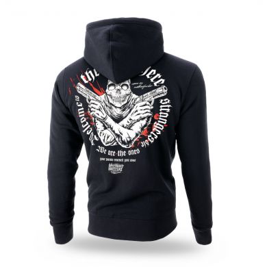 Hoodie aus hochwertiger Baumwolle mit Reißverschluss, versehen mit elastischen Bündchen und zwei Fronttaschen.Auf der Rückseite befindet sich ein großer Aufdruck, der eine Gestalt mit Schädel in der Hand mit zwei Pistolen und der Aufschrift "Welcome to the land where strangers die" zeigt. Auf der Brust befindet sich ein ähnliches Motiv in kleinerem Format.