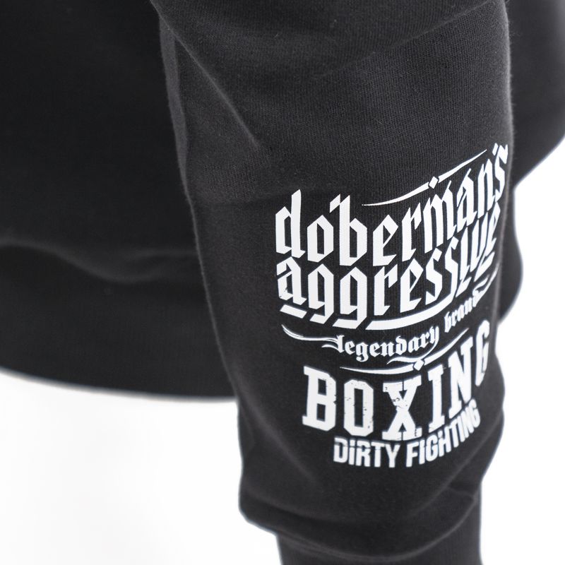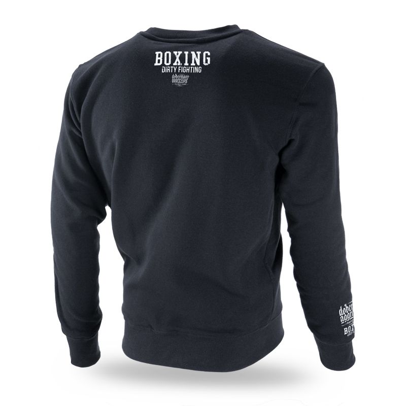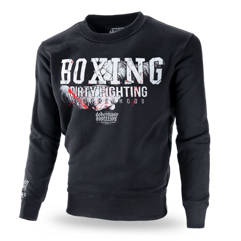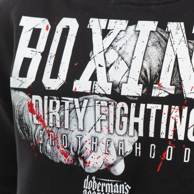 Sweatshirt aus 100 % Baumwolle. Der Saum und die Ärmel sind mit breitem elastischem Bund versehen. Am linken Ärmel befindet sich ein kleines Dobermans Aggressive Logo. Am rechten Ärmel oberhalb des Handgelenks sind ein Logoprint und die Aufschrift BOXING DIRTY FIGHTING platziert. Die Vorderseite ist mit einem großen Print BOXING DIRTY FIGHTING, dem Logo und den Fäusten versehen. Auf der Rückseite befindet sich ein kleines BOXING-Motiv mit Logo.