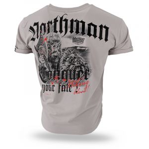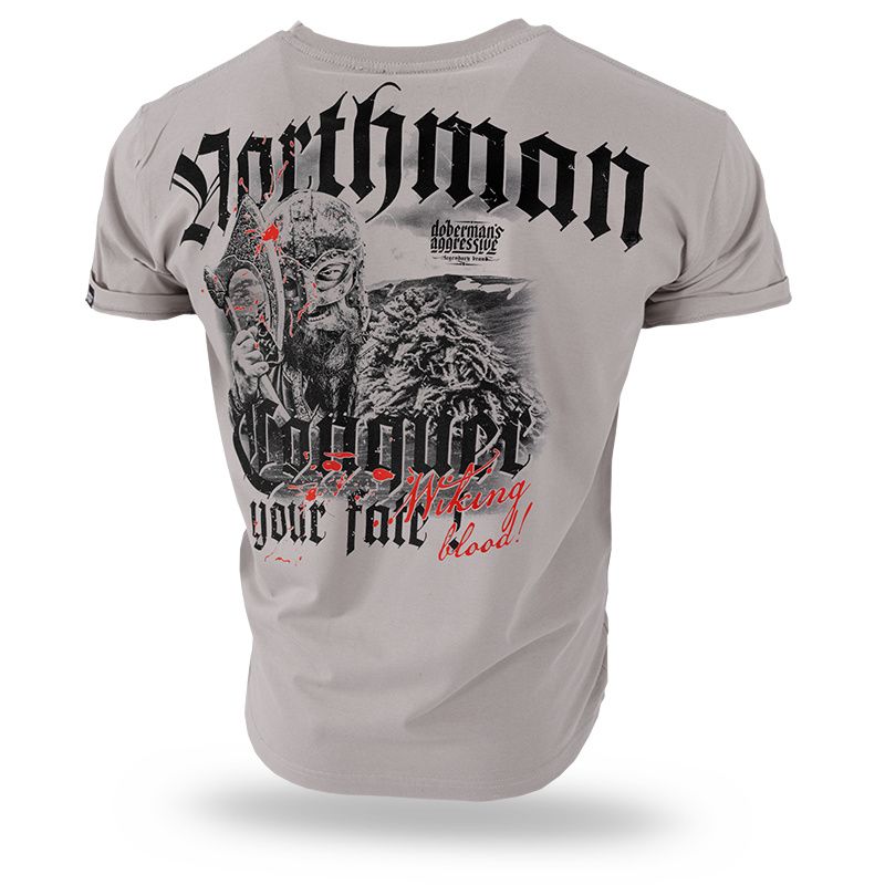 Das T-Shirt besteht aus Baumwolle mit einem Gewicht von 200 g. Auf der Rückseite befindet sich ein großes Motiv eines Wikingers, der eine Axt hält; das Ganze wird durch die Aufschrift Northman Conquer your fate ergänzt. Auf der Vorderseite befindet sich ein kleineres Motiv, das das Hauptmotiv fortsetzt.