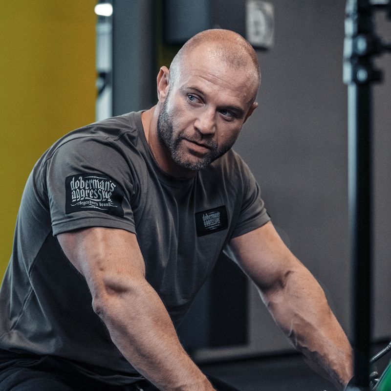 Herrenshirt im Regular-Fit aus hochwertiger Baumwolle. Links an der Brust befindet sich ein schwarzer Aufnäher “Doberman’s Aggressive”. Am Ärmel ist ein Logo-Etikett platziert.