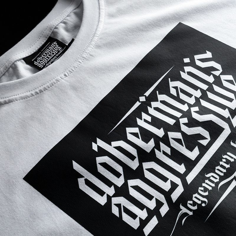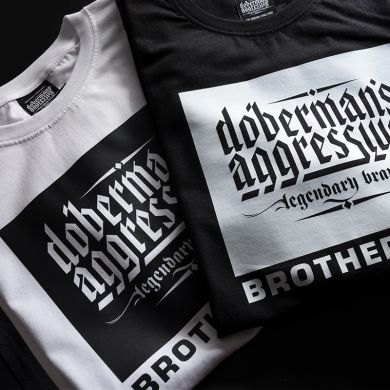 Das T-Shirt besteht aus Baumwolle mit einem Gewicht von 200 g. Auf der Brust befindet sich ein einfaches Motiv: Doberman´s Aggressive Brotherhood.