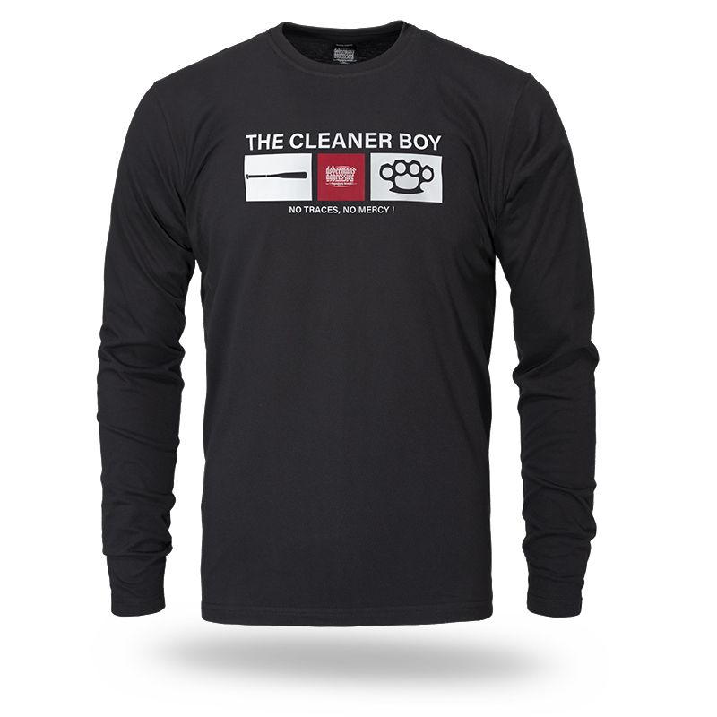 Langarmshirt aus angenehmer Baumwolle. Mit schmalem elastischem Bund am Hals. Auf der Brust mit großer Aufschrift Cleaner boy – No traces,no mercy!