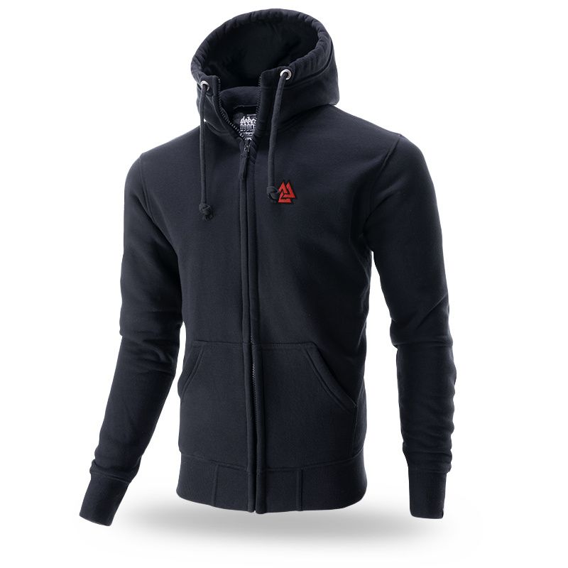 Hoodie aus hochwertiger Baumwolle mit Reißverschluss, versehen mit elastischen Bündchen und zwei Fronttaschen. Auf der Rückseite befindet sich ein großes Asgard legion defense-Bedrucken, ergänzt durch nordische Symbole.