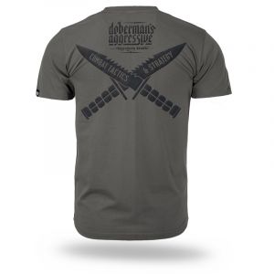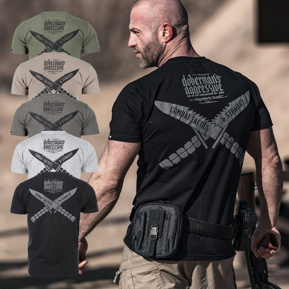 Das T-Shirt besteht aus Baumwolle mit einem Gewicht von 200 g. Auf der Rückseite befindet sich ein Druck "COMBAT TACTICS & STRATEGY".