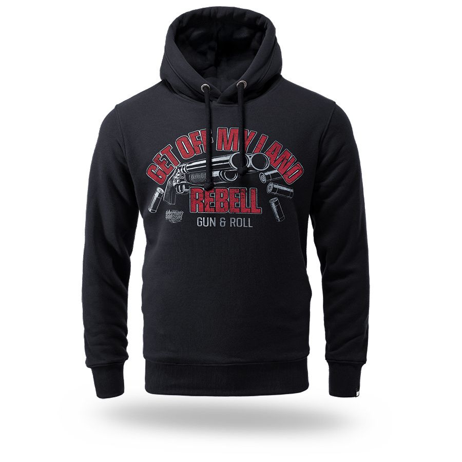 Ein Hoodie von Dobermans Aggressive aus angenehmer Baumwolle mit breitem elastischem Bund an den Ärmeln und am Saum. Auf der Brust mit großer Aufschrift Get Off My Land REBELL Gun & Roll.