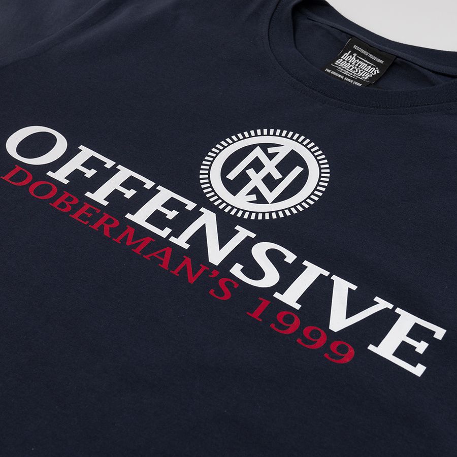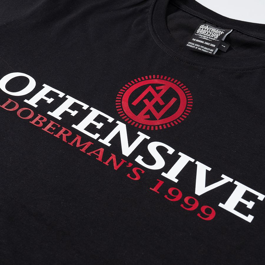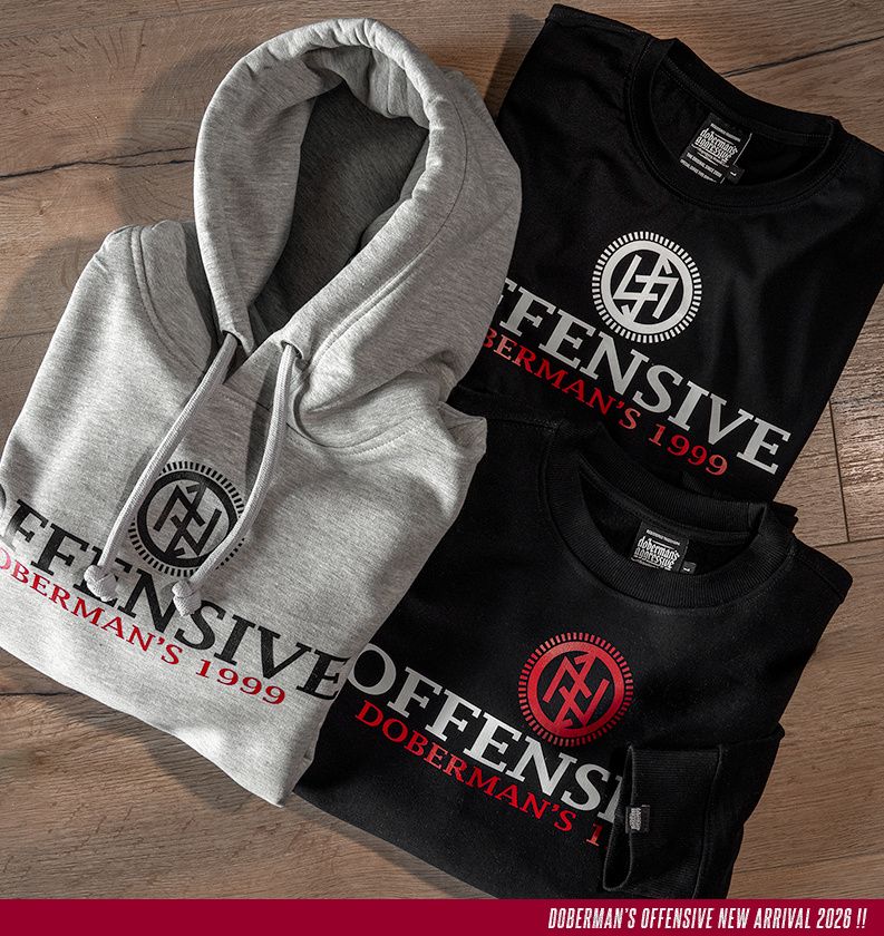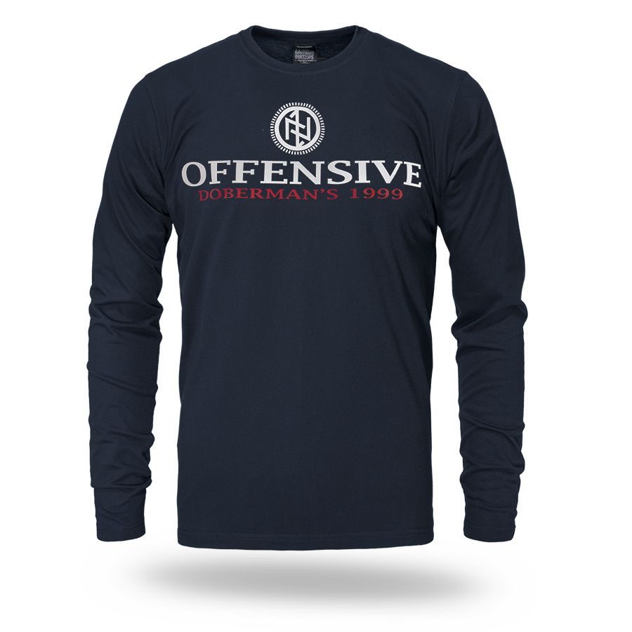 Langarmshirt aus angenehmer Baumwolle. Mit schmalem elastischem Bund am Hals. Auf der Brust mit großer Aufschrift Offensive Doberman´s 1999.