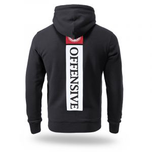 Ein Hoodie von Dobermans Aggressive aus angenehmer Baumwolle mit breitem elastischem Bund an den Ärmeln und am Saum. Auf der Rückseite befindet sich ein Druck „Offensive”.