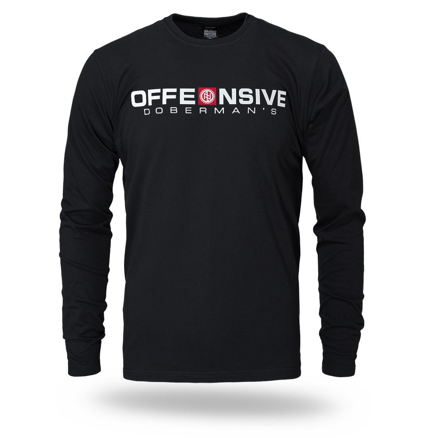 Langarmshirt aus angenehmer Baumwolle. Mit schmalem elastischem Bund am Hals. Auf der Brust mit großer Aufschrift Offensive Doberman´s.