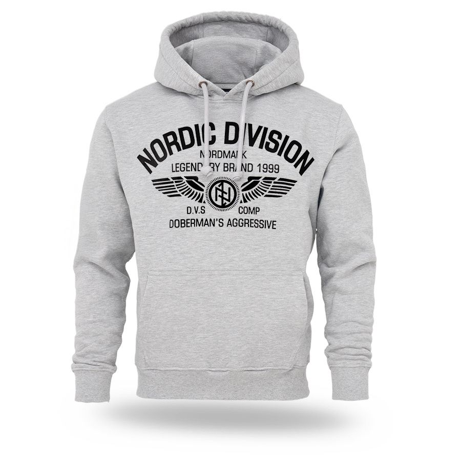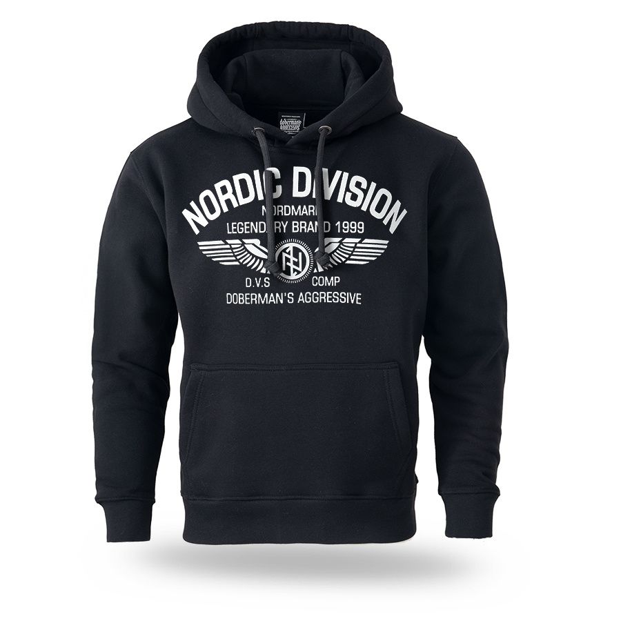 Ein Hoodie von Dobermans Aggressive aus angenehmer Baumwolle mit breitem elastischem Bund an den Ärmeln und am Saum. Auf der Brust mit großer Aufschrift Nordic Division.