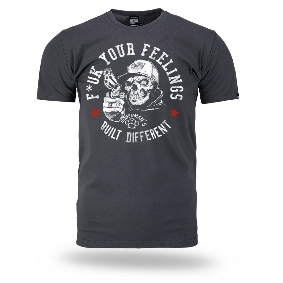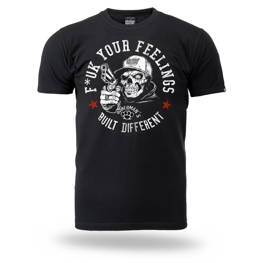 Klassisches Herren-T-Shirt aus hochwertiger Baumwolle mit kurzen Ärmeln.Auf dem linken Ärmel befindet sich ein kleiner Patch mit dem Doberman´s Aggressive-Logo. Auf der Brust mit großer Aufschrift F*ck Your Feelings – Built Different.