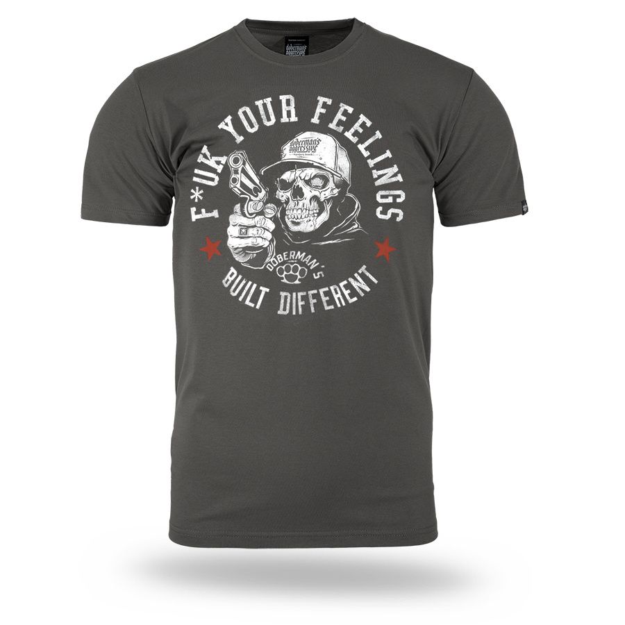 Klassisches Herren-T-Shirt aus hochwertiger Baumwolle mit kurzen Ärmeln.Auf dem linken Ärmel befindet sich ein kleiner Patch mit dem Doberman´s Aggressive-Logo. Auf der Brust mit großer Aufschrift F*ck Your Feelings – Built Different.