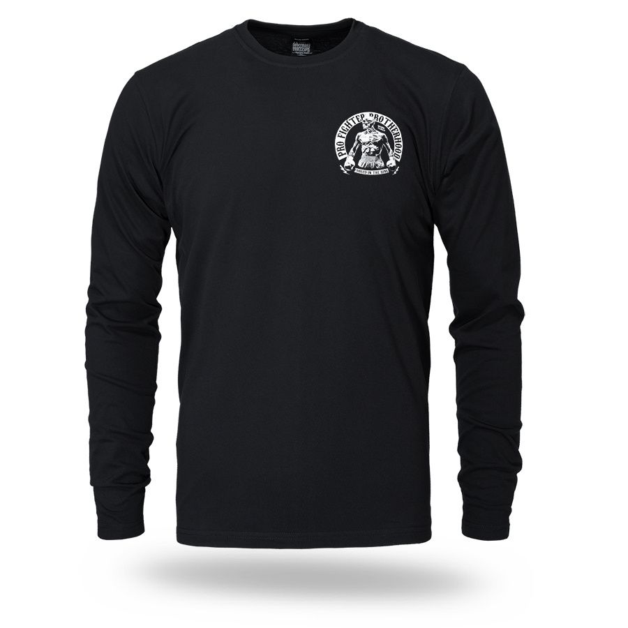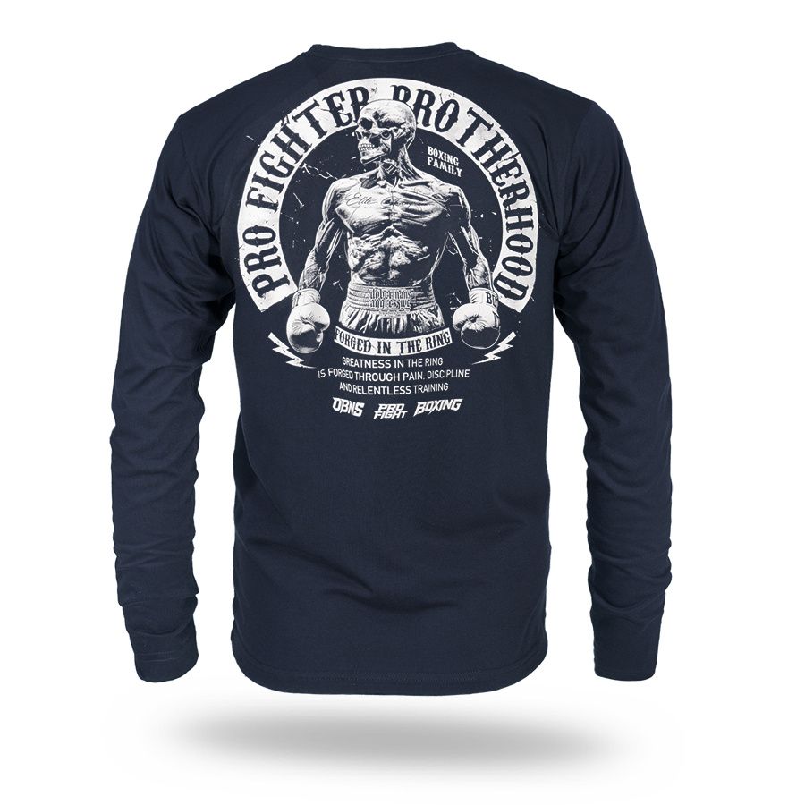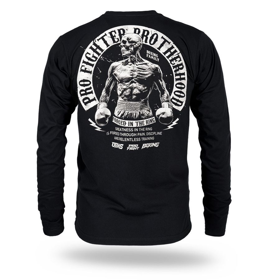 Langarmshirt aus angenehmer Baumwolle. Mit schmalem elastischem Bund am Hals. Vorder- und Rückseite sind mit dem Aufdruck Pro Fighter Brotherhood – Forged in the Ring versehen.