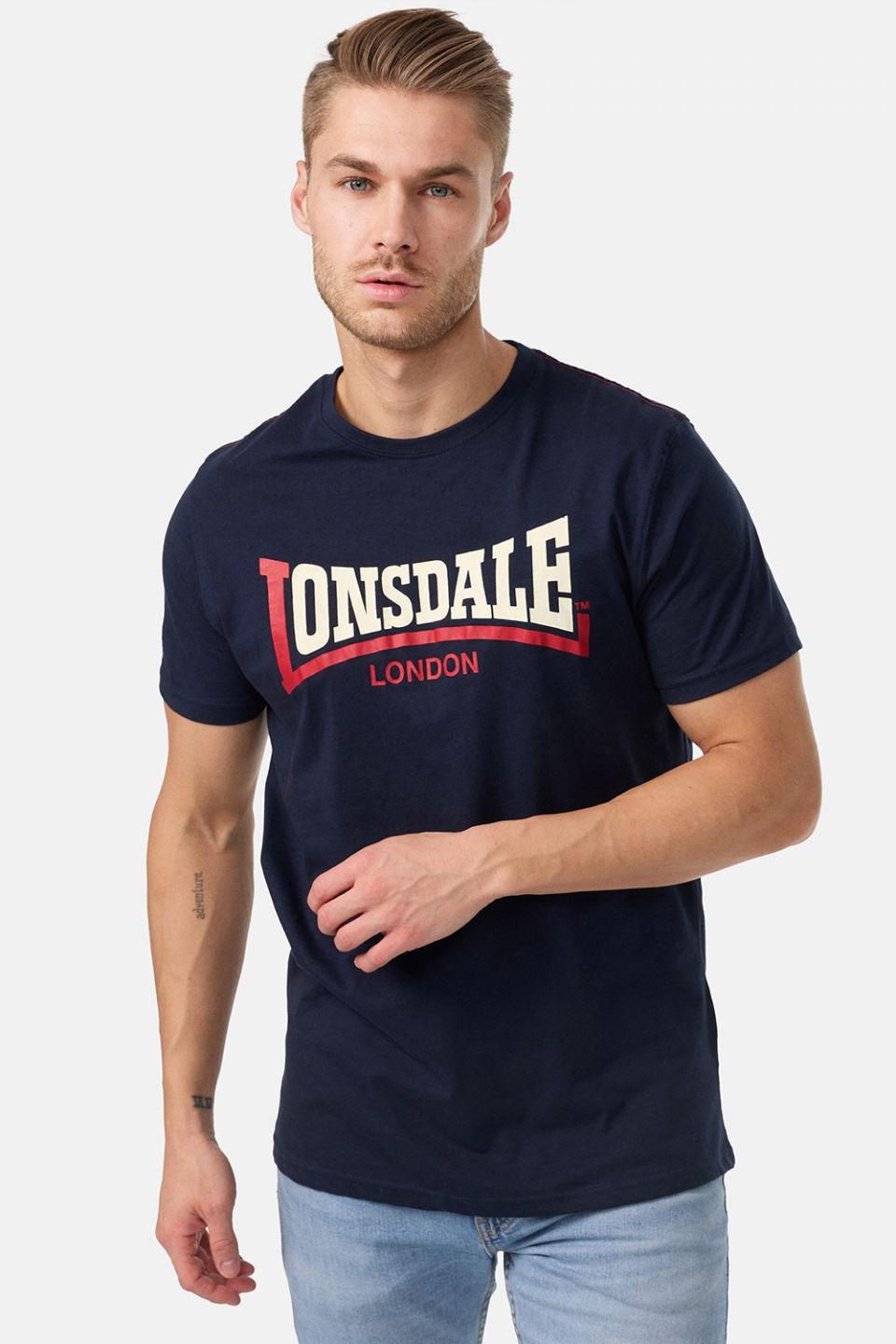 - T-Shirt mit zweifarbigem Logo-Schriftzug auf der Brust und einer farblich abgesetzten Ziernaht im Bereich der Schulter.