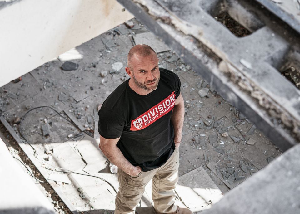 Das T-Shirt besteht aus Baumwolle mit einem Gewicht von 200 g. Die Vorderseite ist mit einem großen Print Division Nordic Company.